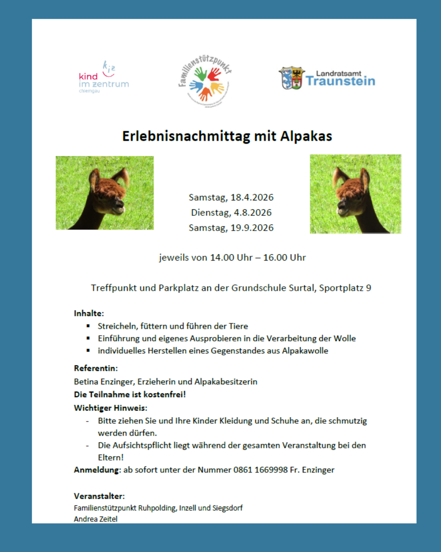 In und um Ruhpolding, Inzell und Siegsdorf gibt es viele Angebote, deren Ziele es ist Sie als Familie zu unterstützen. Unser Familienstützpunkt berät Sie bei Fragen rund um Familienleben und Kindererziehung. Wir vermitteln Ihnen zuständige Stellen und bieten Elternbildungsangebote an.